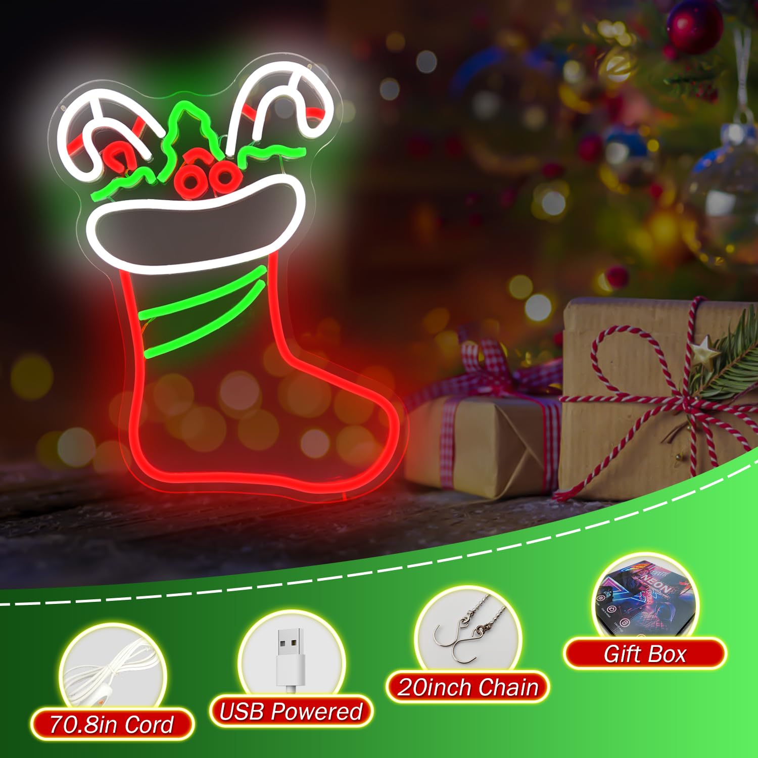 - 🎄CHRISTMAS STOCKING WALL LIGHT:This Christmas neon sign is shaped like a classic festival stocking, full of Christmas-inspired details and bright colors. Christmas LED wall sign emit a warm and festive light and are filled with festive atmosphere, making them an ideal choice that you can’t miss for your Christmas decorations.