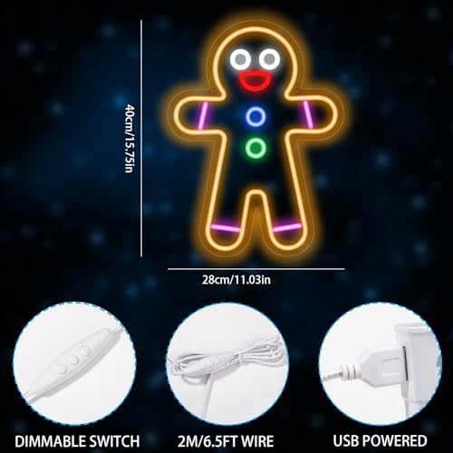 - ✔️【UNIQUE STYLING】Gingerbread man neon sign using handmade artwork.Super fun christmas neon decoration.The dazzling lights and rich colors will make your room or party more attractive.The dimmable light is very soft and suitable for children's room decoration.